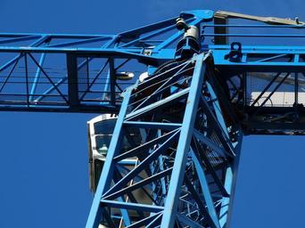 Keywords: crane load crane skyward in the height sky baukran crane arm lift loads lifting crane blue driver's cab