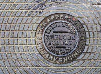 Keywords: crapper sanitary engineer sanitation thomas chelsea london uk cover manhole access underground invention innovation plumbing toilet wc water closet lavatory restroom iron circles lines public health waste environment hygiene recycling ecology management disposal