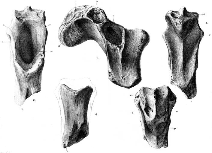 Keywords: Craterosaurus.png en Holotype neural arch of Craterosaurus 1 - dorsal view 2 - ventral view 3 - lateral view 4 - anterior view 5 - posterior view 1874 Seeley H G 1874 On the base of a large lacertian cranium from the Potton Sands presumably dinosaurian Quarterly Journal of the Geological Society of London 30 690 “692 doi 10 1144/GSL JGS 1874 030 01-04 62 Harry Govier Seeley other versions PD-old-70-1923 Stegosauria |