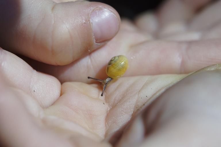 Keywords: crawling snails steinig yellow shell slowly mollusk nature close reptile animal probe gastropoda summer housing snail fauna hand hands protect child naturalist environmental protection careful responsibility carefully keep