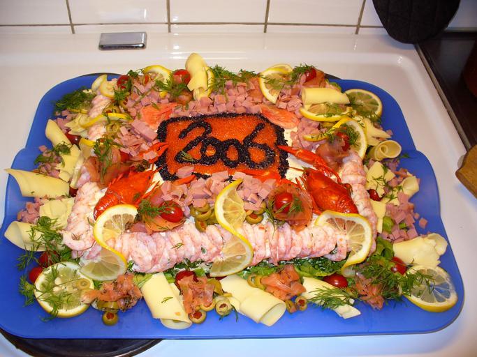 Keywords: CrayfishSandwichLoaf.jpg A new year's sandwich loaf with crayfish Original photo by Yvwv uploaded August 8 2007 Yvwv PD hereby Seafood dishes of Sweden Smörgåstårta Food with inscriptions