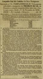Keywords: CRCFP calcium oxide phosphate freight rate advertisement.jpg pt Anúncio da Companhia Real dos Caminhos de Ferro Portugueses mostrando a Tarifa Especial n º 3 para transporte de fosfato de cal entre o Crato e a fronteira com Espanha Esta imagem foi publicada no Diario Illustrado n º 127 de 4 de Novembro de 1872 e digitalizada pela Biblioteca Nacional de Portugal en Advertisement of the Companhia Real dos Caminhos de Ferro Portugueses Royal Company of the Portuguese Railways showing the special fare n º 3 for the transport of calcium oxide phosphate between Crato and the spanish border This image was published on the Diario Illustrado newspaper No 127 of 4th November 1872 and scanned by the Biblioteca Nacional de Portugal 1872-09-21 http //purl pt/14328/1/j-1244-g_1872-11-04/j-1244-g_1872-11-04_item2/j-1244-g_1872-11-04_PDF/j-1244-g_1872-11-04_PDF_24-C-R0150/j-1244-g_1872-11-04_0000_1-4_t24-C-R0150 pdf Companhia Real dos Caminhos de Ferro Portugueses Institution Institution Biblioteca Nacional de Portugal Custom license marker 2015 08 12 Anonymous-EU Uploaded with UploadWizard Public transport information in Portugal Companhia Real dos Caminhos de Ferro Portugueses 1872 in rail transport in Portugal Linha do Leste Images from the Biblioteca Nacional de Portugal |