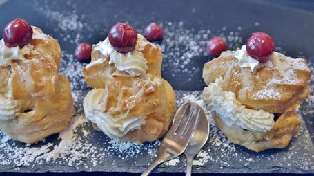 Keywords: cream puff pastries bake baked goods delicious choux pastry sweet feasting cherries eat dessert cake food sweet dish sugar
