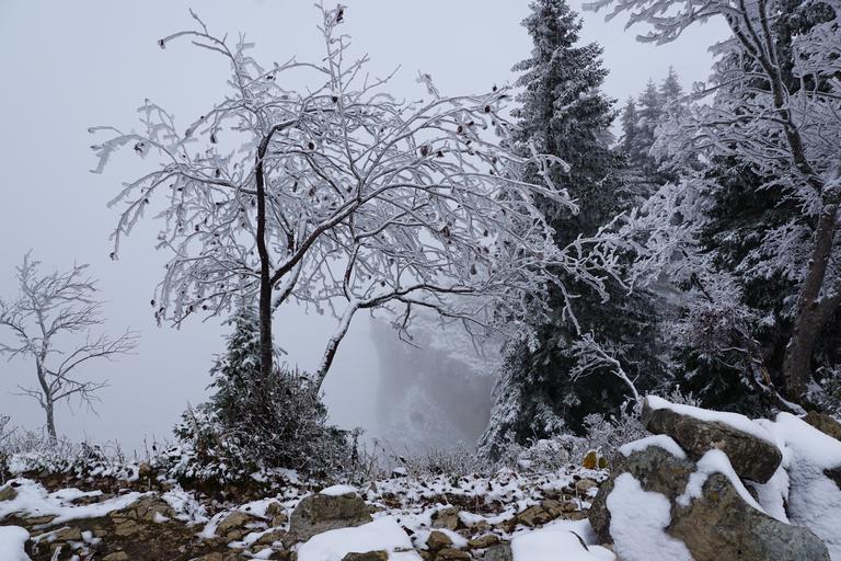 Keywords: creux du van mountains abyss switzerland cliff fog white trees jura winter
