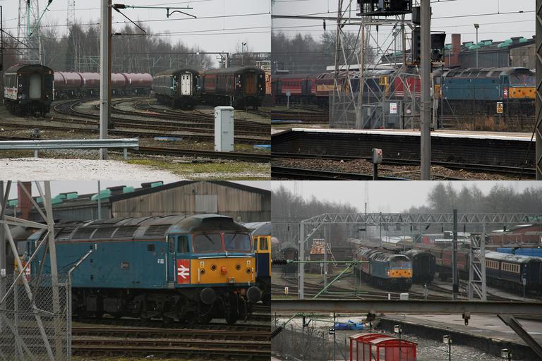 | Keywords: CreweDieselTMDPhotos.jpg en Crewe Diesel TMD in February 2011 Top Left Several passenger coaches and EWS liveried chemical cars viewed from Crewe Station's platform 12 Bottom Left British Rail liveried Express Class 47 47853 in storage Top Right Four Class 47s including EWS 47747 at the rear Bottom Right A view of the four Class 47s and stored passenger coaches from the footbridge at Crewe own Samslipknot Cc-zero Crewe railway station | ||||