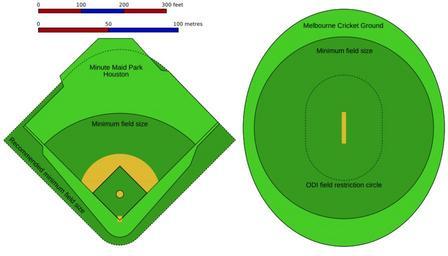 | Keywords: CricketBaseballBasic.svg Comparison between baseball and cricket playing field sizes The minimum sizes are taken directly from the official rules of each game Baseball also has a recommended minimum field size shown by the dashed line but many Major League ballparks do not meet this recommendation Minute Maid Park is illustrated as the MLB park with the longest centre field distance The Melbourne Cricket Ground is illustrated as the largest Test cricket ground own 2006-04-18 David Morgan-Mar Released to public domain Baseball field diagrams Cricket field diagrams SVG sport field diagrams |