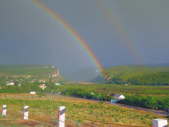 Keywords: crimea landscape scenic rainbow sky clouds buildings forest trees woods mountains valley nature outside summer spring country countryside