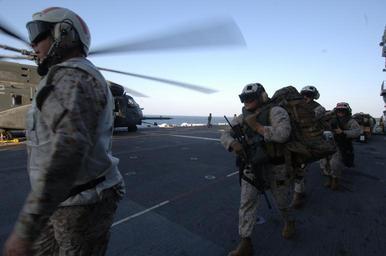 Keywords: Crisis Response Exercise DVIDS63830.jpg en Chief Warrant Officer Bryan Simon Combat Camera Officer of USS Wasp LHD 1 ensures Marines attached to 4th Platoon 2nd Fleet Anti-terrorism Security Team cross the flight deck safely to an MH-53E Sea Dragon of Helicopter Mine Countermeasure Squadron 15 prior to flying ashore during a crisis response exercise Coalition forces are conducting the exercise Nov 1-7 to enhance capabilities in responding to a host nation's request for assistance during a time of a crisis Exercises between the coalition and its regional partners provide an excellent opportunity for the coalition to demonstrate its commitment to maintaining security and stability in the region 2007-11-04 Petty Officer 2nd Class Sandra Palumbo https //www dvidshub net/image/63830 071104-N-+++++-055 2007-11-05 11 15 USS WASP AF PD-USGov-Military-Navy MH-53E Sea Dragon Images from DoD uploaded by Fæ |