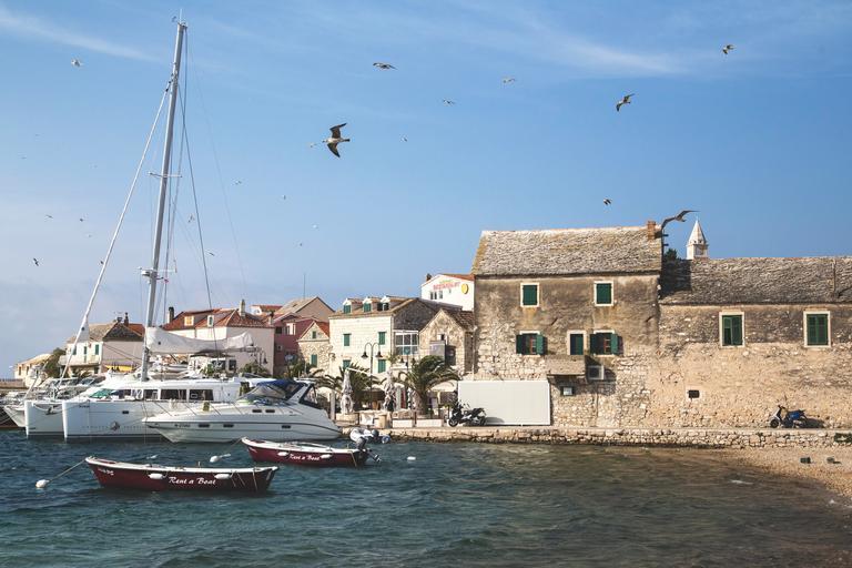 Keywords: croatia sea primosten boats shore town seaside seagull bird sky