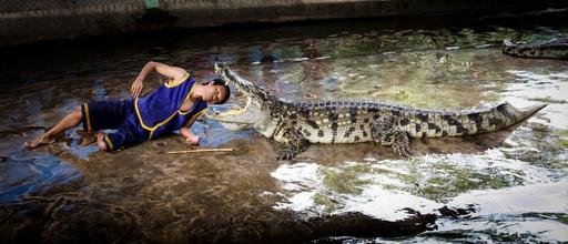 Keywords: crocodile man show reptile open mouth risk danger job main