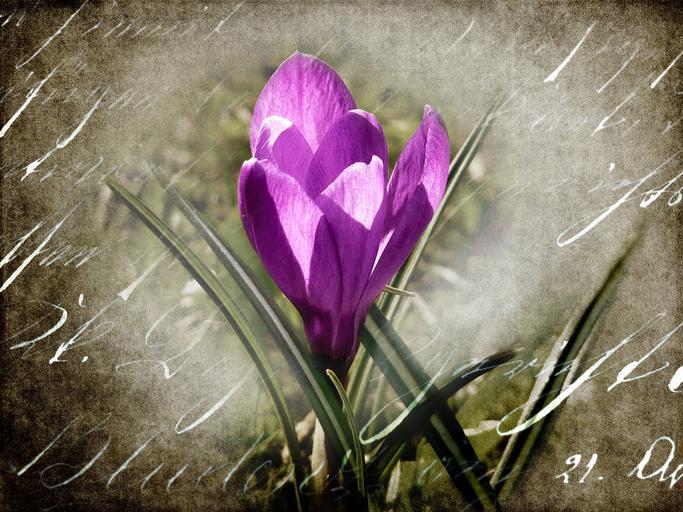 Keywords: crocus flower blossom bloom spring close purple font handwriting macro plant spring flower violet greeting card