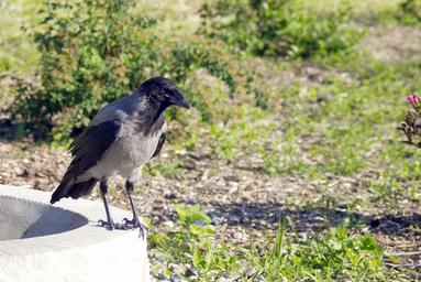 Keywords: crow crows bird nature predator ornithology sky blue bird feeding tray closeup gray gray black park city animals urban birds pebbles