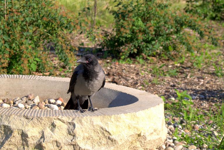 Keywords: crow crows bird nature predator ornithology sky blue bird feeding tray closeup gray gray black park city animals urban birds pebbles