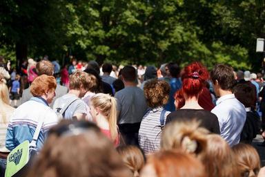 Keywords: crowd crowded event festival group heads many men outdoor people public show women