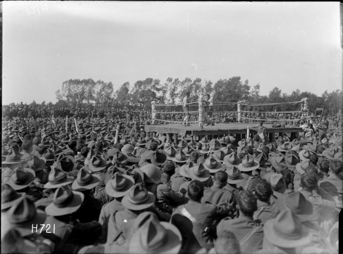 Keywords: blackandwhite monochrome black and white A crowd of World War I soldiers watching two boxers sparring in a ring, during a boxing match at the New Zealand Divisional Sports at Authie, France. Photographed by Henry Armytage Sanders on 23 July 1918. Inscriptions: Inscribed - Photographer's title on negative -bottom left: H721. Quantity: 1 b&w original negative(s). Physical Description: Dry plate glass negative 4.75 x 6.5 inches Crowd of soldiers watching a boxing match at the New Zealand Divisional Sports, Authie. Royal New Zealand Returned and Services' Association :New Zealand official negatives, World War 1914-1918. Ref: 1/2-013325-G. Alexander Turnbull Library, Wellington, New Zealand. natlib.govt.nz/records/22910690 A crowd of World War I soldiers watching two boxers sparring in a ring, during a boxing match at the New Zealand Divisional Sports at Authie, France. Photographed by Henry Armytage Sanders on 23 July 1918. Inscriptions: Inscribed - Photographer's title on negative -bottom left: H721. Quantity: 1 b&w original negative(s). Physical Description: Dry plate glass negative 4.75 x 6.5 inches Crowd of soldiers watching a boxing match at the New Zealand Divisional Sports, Authie. Royal New Zealand Returned and Services' Association :New Zealand official negatives, World War 1914-1918. Ref: 1/2-013325-G. Alexander Turnbull Library, Wellington, New Zealand. natlib.govt.nz/records/22910690 |
