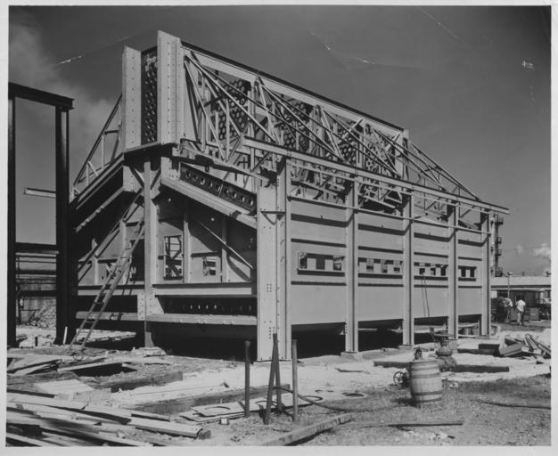 | Keywords: steel steel industry steelindustry steel construction steelconstruction construction industry constructionindustry construction equipment constructionequipment buildings blackandwhite monochrome photo border outdoor architecture black and white Photograph of a Crown Central Petroleum Corporation heater under construction. The structure was built by Alcorn Combustion Company out of Philadelphia, Pennsylvania, with materials provided by John Dollinger Jr., Inc. Scattered construction materials and steel beams are located throughout the site. A ladder is leaning against the left side of the structure. Several men are standing near a building in the far right background. Photograph of a Crown Central Petroleum Corporation heater under construction. The structure was built by Alcorn Combustion Company out of Philadelphia, Pennsylvania, with materials provided by John Dollinger Jr., Inc. Scattered construction materials and steel beams are located throughout the site. A ladder is leaning against the left side of the structure. Several men are standing near a building in the far right background. |