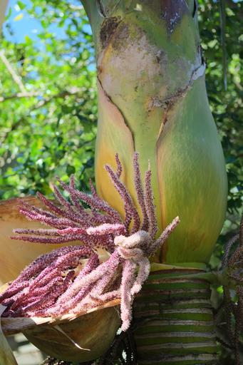 Keywords: Crownshaft and inflorescence of nikau palm.jpg Crownshaft leaf base and lilac inflorescence of mature nīkau palm Own 2016-12-26 Pseudopanax wikipedia en Rhopalostylis sapida Arecaceae flowers Arecaceae in New Zealand