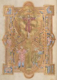 | Keywords: Crucifixion-vita-mors-uta-codex-clm-13601-f3v-c1025.jpg Uta Codex evangeliary Jesus on the Cross occupies the top of the design Eight other images present the Christian significance of the Crucifixion the triumph of life over death Below the Crucifixion are personifications of Life Vita on the right-hand side of Jesus and Death Mors on the other side A crowned Life looks up to a crowned Jesus who returns the gaze Life's orant posture also echoes that of Christ Death is bent falling away from God his face shrouded and his spear broken He is attacked by a branch sprouting from the Cross suggesting the Tree of Life In the left-hand semicircle is Ecclesia also crowned with raised hand and facing the Cross while the right-hand semicircle shows Synagoga with a scroll the Law and knife of circumcision turned away from God and blinded by the border The corner images are events connected with the Crucifixion The upper-left has a personification of the sun Sol while the upper-right shows the moon Luna The lower-left shows resurrected saints who echo Life's posture while in the lower-right the Temple veil is torn Their significance is explained by the surrounding text The Sun of Justice suffers on the cross; the Church mourns the death of Christ; Gentiles converted through faith began to live; the darkness of the Law was removed As with the other elements of the schematic composition the new life made possible by the Crucifixion is on the right-hand side of Christ and the Cross while opposing but complementary subjects are on His left Munich Digital Library http //daten digitale-sammlungen de/bsb00075075/image_10 The artist is unknown 1025 PD-old-100 PD-1996 <gallery>File Uta Codex Evangeliary Symbolic Crucifixion of Christ ca 1020 JPG Smaller version</gallery> Uta Codex Crucifixion of Christ King 11th-century illuminated manuscripts Ottonian manuscripts Niedermuenster Abbey Regensburg Manuscripts in the Bayerische Staatsbibliothek |