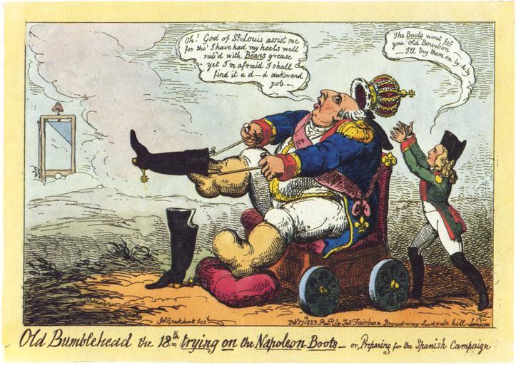 Keywords: Cruikshank - Old Bumblehead.png Artwork Creator George Cruikshank Louis XVIII Napoleon II LangSwitch Trotz des Bärenfetts gemeint ist die Unterstützung der Spanienpläne durch Rußland ist der französische König Ludwig XVIII nicht in der Lage in Napoleons Stiefel zu steigen Napoleons Sohn steht schon bereit um die Bourbonenkrone im Falle eines Sturzes aufzufangen In spite of the Bears grease by which Russian support is meant the French king Louis XVIII is not able to put on Napoleon's boots Napoleon's son stands ready to catch the Bourbon crown if it might fall A pesar de la grasa de oso por el cual se entiende el apoyo de Rusia el rey francés Luis XVIII no es capaz de poner en las botas Napoleones Napoleones hijo está dispuesto a coger la corona borbónica si podrÃa caer En dépit de la graisse d'ours par lequel on entend le soutien russe le roi français Louis XVIII n'est pas en mesure de mettre sur les bottes Napoléons Le fils Napoléon est prêt à prendre la couronne Bourbon si elle pourrait tomber Ondanks het berenvet waarmee de Russische steun voor het plan bedoeld wordt is de Franse koning Lodewijk de 18<sup>de</sup> niet in staat om in Napoleons schoenen te gaan staan Napoleons zoon staat klaar om de kroon van de Bourbons te vangen mocht deze vallen 1823-02-17 etching paper hand-coloured mm 247 351 Institution British Museum Caricatures VI p 34 object history ProvenanceEvent transfer 1935 British Library British Museum exhibition history credit line inscription Old Bumblehead the 18th trying on the Napoleon Boots “ or Preparing for the Spanish Campaign title bottom en inscription Oh God of S<sup>t</sup>Louis assist me for tho' I have had my heels well rub'd with Bears grease yet I'm afraid I shall find it a d__d awkward job speech ballon top en inscription The boots wont fit you old Bourbon I'll try them on by by speech ballon right en inscription Geo Cruikshank fec signature bottom la inscription Feby 17th 1823 Pubd by Jn Fairburn Broadway Ludgate Hill London date / publishers mark bottom right en accession number Invno 1935 0522 6 34 http //www britishmuseum org/research/search_the_collection_database/search_object_details aspx objectid 3018312 partid 1 Source PD-old-100 PD-old-100 DEFAULTSORT 1823 Cruikshank 1823 in art Caricatures of politicians Boots in art Louis XVIII of France Engravings by George Cruikshank Speech balloons |