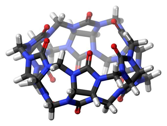 Keywords: Cucurbit(6)uril-(side)-3D-sticks.png Stick model of the Cucurbit6uril molecule one of the cucurbiturils a group of macrocyclic compounds which have many applications in supramolecular chemistry This image shows the side view Colour code 505050 Carbon C black<br> F0F0F0 Hydrogen H white<br> F51E1E Oxygen O red<br> 3C50FA Nitrogen N blue<br> 2011-06-03 own DS Visualizer Jynto talk Top view ball-and-stick version Top view space-filling version Top view stick version Side view ball-and-stick version Side view space-filling version cc-zero Cucurbiturils Images by Jynto 3D-sticks models |