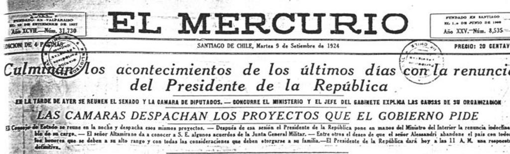 View Original: | Culminan los acontecimientos de los últimos días con la renuncia del Presidente de la República (El Mercurio, 9 de septiembre de 1924).jpg (800x242) | |||
