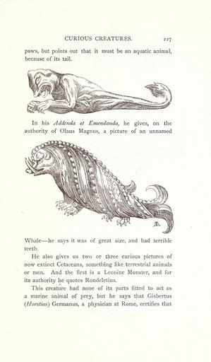 Keywords: Curious creatures in zoology (14947852804).jpg CURIOUS CREATURES <br> 227 <br> paws but points out that it must be an aquatic animal <br> because of its tail <br> In his Addenda et Emendanda he gives on the <br> authority of Olaus Magnus a picture of an unnamed <br> Whale he says it was of great size and had terrible <br> teeth <br> He also gives us two or three curious pictures of <br> now extinct Cetaceans something like terrestrial animals <br> or men And the first is a Leonine Monster and for <br> its authority he quotes Rondeletius <br> This creature had none of its parts fitted to act as <br> a marine animal of prey but he says that Gisbertus <br> Horstius Germanus a physician at Rome certifies that 23574982 76213 32031 Page 227 Text http //www biodiversitylibrary org/page/23574982 1890 10 5962/bhl title 32031 Ashton John NameFound Gisbertus NameFound Horstius NameFound Magnus NameFound Rondeletius Biodiversity Heritage Library Leviathans Curious creatures in zoology; with 130 illus throughout the text Mermaids Monsters Are Real Animals University of California Libraries archive org bhl page 23574982 dc identifier http //biodiversitylibrary org/page/23574982 bhlMonstersRreal Halloween mermaid leviathan university of california libraries archive org bhlmonstersrreal Information field Flickr posted date ISOdate 2014-10-19 CC-BY-2 0 BioDivLibrary https //flickr com/photos/61021753 N02/14947852804 2015-08-25 20 54 21 cc-by-2 0 PD-old-70-1923 leviathan Curious creatures in zoology Photos uploaded from Flickr by Fæ using a script