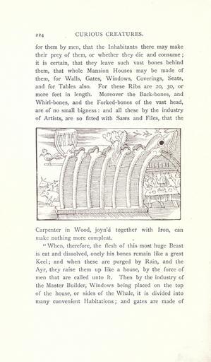 Keywords: Curious creatures in zoology (14948426513).jpg 224 CURIOUS CREATURES <br> for them by men that the Inhabitants there may make <br> their prey of them or whether they die and consume ; <br> it is certain that they leave such vast bones behind <br> them that whole Mansion Houses may be made of <br> them for Walls Gates Windows Coverings Seats <br> and for Tables also For these Ribs are 20 30 or <br> more feet in length Moreover the Back-bones and <br> Whirl-bones and the Forked-bones of the vast head <br> are of no small bigness and all these by the industry <br> of Artists are so fitted with Saws and Files that the <br> Carpenter in Wood joyn'd together with Iron can <br> make nothing more compleat <br> When therefore the flesh of this most huge Beast <br> is eat and dissolved onely his bones remain like a great <br> Keel ; and when these are purged by Rain and the <br> Ayr they raise them up like a house by the force of <br> men that are called unto it Then by the industry of <br> the Master Builder Windows being placed on the top <br> of the house or sides of the Whale it is divided into <br> many convenient Habitations; and gates are made of 23574979 76213 32031 Page 224 Text http //www biodiversitylibrary org/page/23574979 1890 10 5962/bhl title 32031 Ashton John Biodiversity Heritage Library Curious creatures in zoology; with 130 illus throughout the text Monsters Are Real Animals University of California Libraries archive org bhl page 23574979 dc identifier http //biodiversitylibrary org/page/23574979 bhlMonstersRreal Halloween university of california libraries archive org bhlmonstersrreal Information field Flickr posted date ISOdate 2014-10-19 CC-BY-2 0 BioDivLibrary https //flickr com/photos/61021753 N02/14948426513 2015-08-25 20 52 31 cc-by-2 0 PD-old-70-1923 Curious creatures in zoology Photos uploaded from Flickr by Fæ using a script