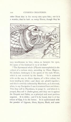 | Keywords: Curious creatures in zoology (14947846874).jpg 222 <br> CURIOUS CREATURES <br> other Beast that is his enemy sets upon him ; nor is it <br> a wonder that he hath so many Horns though they be <br> very troublesome to him ; when as between his eyes <br> the space of his forehead is 15 or 20 foot <br> The Spermaceti whale Physeter macrocephalus is the <br> subject of a curious story according to Olaus Magnus <br> He declares Ambergris is the sperm of the male Whale <br> which is not received by the female It is scattered <br> wide on the sea in divers figures of a blew colour but <br> more tending to white ; and these are glew'd together ; <br> and this is carefully collected by Marriners as I observed <br> when in my Navigation I saw it scattered here and there <br> This they sell to Physitians to purge it ; and when it is <br> purged they call it Amber-grcese and they use it against <br> the Dropsie and Palsie as a principal and most pretious <br> unguent It is white ; and if it be found that is of the <br> colour of Gyp it is the better It is sophisticated with <br> the powder of Lignum Aloes Styrax Musk and some 23574977 76213 32031 Page 222 Text http //www biodiversitylibrary org/page/23574977 1890 10 5962/bhl title 32031 Ashton John NameFound Lignum NameConfirmed Lignum NameBankID 10125911 NameFound Magnus NameFound Physeter macrocephalus NameConfirmed Physeter macrocephalus EOLID 328547 NameBankID 1761360 NameFound Physeter macrocephalus NameConfirmed Physeter macrocephalus EOLID 328547 NameBankID 2484077 NameFound Styrax NameConfirmed Styrax L EOLID 38079 Biodiversity Heritage Library Leviathans Curious creatures in zoology; with 130 illus throughout the text Monsters Are Real Animals University of California Libraries archive org bhl page 23574977 dc identifier http //biodiversitylibrary org/page/23574977 bhlMonstersRreal Halloween leviathan university of california libraries archive org bhlmonstersrreal Information field Flickr posted date ISOdate 2014-10-19 CC-BY-2 0 BioDivLibrary https //flickr com/photos/61021753 N02/14947846874 2015-08-25 20 52 37 cc-by-2 0 PD-old-70-1923 leviathan Curious creatures in zoology Photos uploaded from Flickr by Fæ using a script |