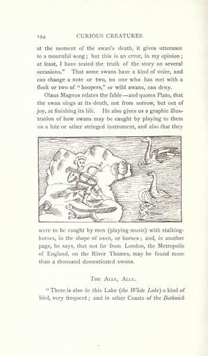 Keywords: Curious creatures in zoology (14948397953).jpg i 9 4 CURIOUS CREATURES <br> at the moment of the swan's death it gives utterance <br> to a mournful song ; but this is an error in my opinion ; <br> at least I have tested the truth of the story on several <br> occasions That some swans have a kind of voice and <br> can change a note or two no one who has met with a <br> flock or two of hoopers or wild swans can deny <br> Olaus Magnus relates the fable and quotes Plato that <br> the swan sings at its death not from sorrow but out of <br> joy at finishing its life He also gives us a graphic illus- <br> tration of how swans may be caught by playing to them <br> on a lute or other stringed instrument and also that they <br> were to be caught by men playing music with stalking- <br> horses in the shape of oxen or horses ; and in another <br> page he says that not far from London the Metropolis <br> of England on the River Thames may be found more <br> than a thousand domesticated swans <br> THE ALLE ALLE <br> There is also in this Lake the White Lake a kind of <br> bird very frequent ; and in other Coasts of the Bothnick 23574949 76213 32031 Page 194 Text http //www biodiversitylibrary org/page/23574949 1890 10 5962/bhl title 32031 Ashton John NameFound Magnus Biodiversity Heritage Library Curious creatures in zoology; with 130 illus throughout the text Monsters Are Real Animals University of California Libraries archive org bhl page 23574949 dc identifier http //biodiversitylibrary org/page/23574949 bhlMonstersRreal Halloween university of california libraries archive org bhlmonstersrreal Information field Flickr posted date ISOdate 2014-10-19 CC-BY-2 0 BioDivLibrary https //flickr com/photos/61021753 N02/14948397953 2015-08-25 21 51 58 cc-by-2 0 PD-old-70-1923 Curious creatures in zoology Photos uploaded from Flickr by Fæ using a script