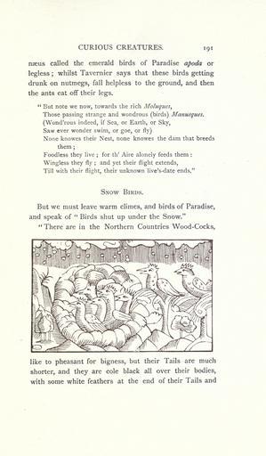 | Keywords: Curious creatures in zoology (15382561377).jpg CURIOUS CREATURES 191 <br> naeus called the emerald birds of Paradise apoda or <br> legless ; whilst Tavernier says that these birds getting <br> drunk on nutmegs fall helpless to the ground and then <br> the ants eat off their legs <br> But note we now towards the rich Moluques <br> Those passing strange and wondrous birds Manueques <br> Wond'rous indeed if Sea or Earth or Sky <br> Saw ever wonder swim or goe or fly <br> None knowes their Nest none knowes the dam that breeds <br> them; <br> Foodless they live ; for th' Aire alonely feeds them <br> Wingless they fly ; and yet their flight extends <br> Till with their flight their unknown live's-date ends <br> SNOW BIRDS <br> But we must leave warm climes and birds of Paradise <br> and speak of Birds shut up under the Snow <br> There are in the Northern Countries Wood-Cocks <br> like to pheasant for bigness but their Tails are much <br> shorter and they are cole black all over their bodies <br> with some white feathers at the end of their Tails and 23574946 76213 32031 Page 191 Text http //www biodiversitylibrary org/page/23574946 1890 10 5962/bhl title 32031 Ashton John NameFound None NameConfirmed None EOLID 2913255 Biodiversity Heritage Library Curious creatures in zoology; with 130 illus throughout the text Monsters Are Real Animals University of California Libraries archive org bhl page 23574946 dc identifier http //biodiversitylibrary org/page/23574946 bhlMonstersRreal Halloween university of california libraries archive org bhlmonstersrreal Information field Flickr posted date ISOdate 2014-10-19 CC-BY-2 0 BioDivLibrary https //flickr com/photos/61021753 N02/15382561377 2015-08-25 21 52 31 cc-by-2 0 PD-old-70-1923 Curious creatures in zoology Photos uploaded from Flickr by Fæ using a script |