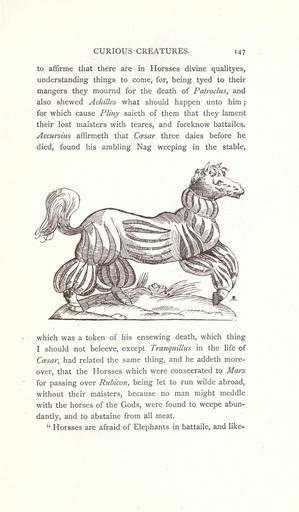 Keywords: Curious creatures in zoology (14948372973).jpg CURIOUS CREATURES 147 <br> to affirme that there are in Horsses divine qualityes <br> understanding things to come for being tyed to their <br> mangers they mournd for the death of Patroclus and <br> also shewed Achilles what should happen unto him ; <br> for which cause Pliny saieth of them that they lament <br> their lost maisters with teares and foreknow battailes <br> Accursius affirmeth that Ccesar three daies before he <br> died found his ambling Nag weeping in the stable <br> which was a token of his ensewing death which thing <br> I should not beleeve except Tranquillus in the life of <br> Ccesar had related the same thing and he addeth more- <br> over that the Horsses which were consecrated to Mars <br> for passing over Rubicon being let to run wilde abroad <br> without their maisters because no man might meddle <br> with the horses of the Gods were found to weepe abun- <br> dantly and to abstaine from all meat <br> Horsses are afraid of Elephants in battaile and like- 23574902 76213 32031 Page 147 Text http //www biodiversitylibrary org/page/23574902 1890 10 5962/bhl title 32031 Ashton John NameFound Accursius affirmeth NameFound Patroclus NameConfirmed Patroclus EOLID 12066152 NameBankID 4285700 NameFound Tranquillus Biodiversity Heritage Library Curious creatures in zoology; with 130 illus throughout the text Monsters Are Real Animals University of California Libraries archive org bhl page 23574902 dc identifier http //biodiversitylibrary org/page/23574902 bhlMonstersRreal Halloween university of california libraries archive org bhlmonstersrreal Information field Flickr posted date ISOdate 2014-10-19 CC-BY-2 0 BioDivLibrary https //flickr com/photos/61021753 N02/14948372973 2015-08-25 21 52 22 cc-by-2 0 PD-old-70-1923 Curious creatures in zoology Photos uploaded from Flickr by Fæ using a script