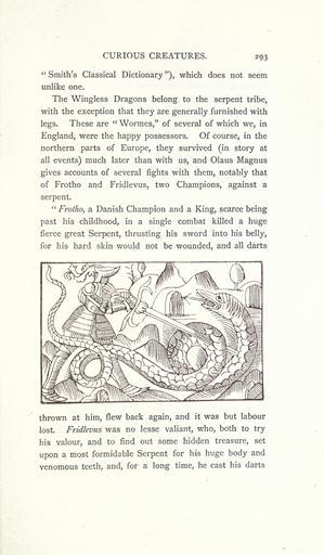 Keywords: Curious creatures in zoology (15382500728).jpg CURIOUS CREATURES <br> 293 <br> Smith's Classical Dictionary which does not seem <br> unlike one <br> The Wingless Dragons belong to the serpent tribe <br> with the exception that they are generally furnished with <br> legs These are Wormes of several of which we in <br> England were the happy possessors Of course in the <br> northern parts of Europe they survived in story at <br> all events much later than with us and Olaus Magnus <br> gives accounts of several fights with them notably that <br> of Frotho and Fridlevus two Champions against a <br> serpent <br> Frotho a Danish Champion and a King scarce being <br> past his childhood in a single combat killed a huge <br> fierce great Serpent thrusting his sword into his belly <br> for his hard skin would not be wounded and all darts <br> thrown at him flew back again and it was but labour <br> lost Fridlevus was no lesse valiant who both to try <br> his valour and to find out some hidden treasure set <br> upon a most formidable Serpent for his huge body and <br> venomous teeth and for a long time he cast his darts 23575048 76213 32031 Page 293 Text http //www biodiversitylibrary org/page/23575048 1890 10 5962/bhl title 32031 Ashton John NameFound Magnus Biodiversity Heritage Library Curious creatures in zoology; with 130 illus throughout the text Monsters Are Real Animals University of California Libraries archive org bhl page 23575048 dc identifier http //biodiversitylibrary org/page/23575048 bhlMonstersRreal Halloween university of california libraries archive org bhlmonstersrreal Information field Flickr posted date ISOdate 2014-10-19 CC-BY-2 0 BioDivLibrary https //flickr com/photos/61021753 N02/15382500728 2015-08-25 20 53 08 cc-by-2 0 PD-old-70-1923 Curious creatures in zoology Photos uploaded from Flickr by Fæ using a script