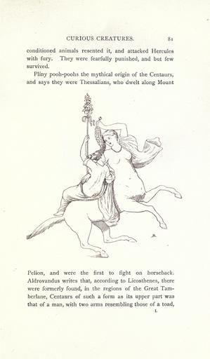 | Keywords: Curious creatures in zoology (14947768464).jpg CURIOUS CREATURES <br> 81 <br> conditioned animals resented it and attacked Hercules <br> with fury They were fearfully punished and but few <br> survived <br> Pliny pooh-poohs the mythical origin of the Centaurs <br> and says they were Thessalians who dwelt along Mount <br> Pelion and were the first to fight on horseback <br> Aldrovandus writes that according to Licosthenes there <br> were formerly found in the regions of the Great Tam- <br> berlane Centaurs of such a form as its upper part was <br> that of a man with two arms resembling those of a toad 23574836 76213 32031 Page 81 Text http //www biodiversitylibrary org/page/23574836 1890 10 5962/bhl title 32031 Ashton John NameFound Aldrovandus NameFound Pelion NameConfirmed Pelion W F Kirby 1858 EOLID 20586 Biodiversity Heritage Library Curious creatures in zoology; with 130 illus throughout the text Monsters Are Real Animals University of California Libraries archive org bhl page 23574836 dc identifier http //biodiversitylibrary org/page/23574836 bhlMonstersRreal Halloween university of california libraries archive org bhlmonstersrreal Information field Flickr posted date ISOdate 2014-10-19 CC-BY-2 0 BioDivLibrary https //flickr com/photos/61021753 N02/14947768464 2015-08-25 21 53 20 cc-by-2 0 PD-old-70-1923 Curious creatures in zoology Photos uploaded from Flickr by Fæ using a script |