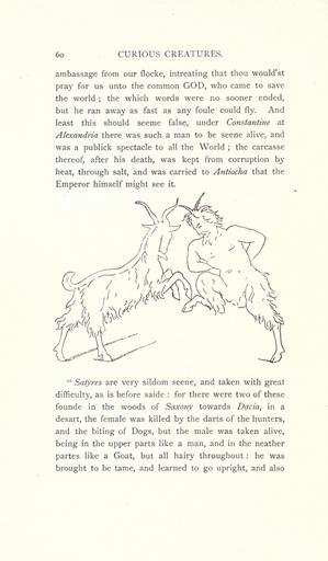 Keywords: Curious creatures in zoology (15381874479).jpg 6o <br> CURIOUS CREATURES <br> ambassage from our flocke intreating that thou would'st <br> pray for us unto the common GOD who came to save <br> the world ; the which words were no sooner ended <br> but he ran away as fast as any foule could fly And <br> least this should seeme false under Constantine at <br> Alexandria there was such a man to be scene alive and <br> was a publick spectacle to all the World ; the carcasse <br> thereof after his death was kept from corruption by <br> heat through salt and was carried to Antiocha that the <br> Emperor himself might see it <br> Satyres are very sildom scene and taken with great <br> difficulty as is before saide for there were two of these <br> founde in the woods of Saxony towards Dacia in a <br> desart the female was killed by the darts of the hunters <br> and the biting of Dogs but the male was taken alive <br> being in the upper parts like a man and in the neather <br> partes like a Goat but all hairy throughout he was <br> brought to be tame and learned to go upright and also 23574815 76213 32031 Page 60 Text http //www biodiversitylibrary org/page/23574815 1890 10 5962/bhl title 32031 Ashton John Biodiversity Heritage Library Curious creatures in zoology; with 130 illus throughout the text Monsters Are Real Animals University of California Libraries archive org bhl page 23574815 dc identifier http //biodiversitylibrary org/page/23574815 bhlMonstersRreal Halloween university of california libraries archive org bhlmonstersrreal Information field Flickr posted date ISOdate 2014-10-19 CC-BY-2 0 BioDivLibrary https //flickr com/photos/61021753 N02/15381874479 2015-08-25 21 51 28 cc-by-2 0 PD-old-70-1923 Curious creatures in zoology Photos uploaded from Flickr by Fæ using a script |