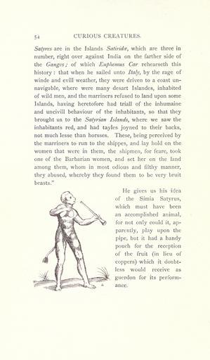 Keywords: Curious creatures in zoology (15569345752).jpg 54 CURIOUS CREATURES <br> Satyrcs are in the Islands Satiridcc which are three in <br> number right over against India on the farther side of <br> the Ganges; of which Euphemus Car rehearseth this <br> history that when he sailed unto Italy by the rage of <br> winde and evill weather they were driven to a coast un- <br> navigable where were many desart Islandes inhabited <br> of wild men and the marriners refused to land upon some <br> Islands having heretofore had triall of the inhumaine <br> and uncivill behaviour of the inhabitants so that they <br> brought us to the Satyrian Islands where we saw the <br> inhabitants red and had tayles joyned to their backs <br> not much lesse than horsses These being perceived by <br> the marriners to run to the shippes and lay hold on the <br> women that were in them the shipmen for fearc took <br> one of the Barbarian women and set her on the land <br> among them whom in most odious and filthy manner <br> they abused whereby they found them to be very bruit <br> beasts <br> He gives us his idea <br> of the Simia Satyrus <br> which must have been <br> an accomplished animal <br> for not only could it ap- <br> parently play upon the <br> pipe but it had a handy <br> pouch for the reception <br> of the fruit in lieu of <br> coppers which it doubt- <br> less would receive as <br> guerdon for its perform- <br> ance 23574809 76213 32031 Page 54 Text http //www biodiversitylibrary org/page/23574809 1890 10 5962/bhl title 32031 Ashton John NameFound Euphemus NameConfirmed Euphemus NameBankID 4166117 NameFound Satyrus NameConfirmed Satyrus EOLID 11018434 NameBankID 113444 NameFound Simia NameConfirmed Simia NameBankID 113860 Biodiversity Heritage Library Curious creatures in zoology; with 130 illus throughout the text Monsters Are Real Animals University of California Libraries archive org bhl page 23574809 dc identifier http //biodiversitylibrary org/page/23574809 bhlMonstersRreal Halloween university of california libraries archive org bhlmonstersrreal Information field Flickr posted date ISOdate 2014-10-19 CC-BY-2 0 BioDivLibrary https //flickr com/photos/61021753 N02/15569345752 2015-08-25 21 51 35 cc-by-2 0 PD-old-70-1923 Curious creatures in zoology Photos uploaded from Flickr by Fæ using a script |