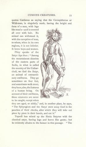 | Keywords: Curious creatures in zoology (15382352938).jpg CURIOUS CREATURES <br> 53 <br> quotes Cardanus as saying that the Cercopithecus or <br> Wild-man is singularly made having the height and <br> form of a man with legs <br> like man's and is covered <br> all over with hair No <br> animal can withstand it <br> with the exception of man <br> to whom when in its own <br> regions it is not inferior <br> It loves boys and women <br> Pliny speaks of the <br> Satyr Ape thus Among <br> the mountainous districts <br> of the eastern parts of <br> India in what is called <br> the country of the Cathar- <br> cludi we find the Satyr <br> an animal of extraordi- <br> nary swiftness They go <br> sometimes on four feet <br> and sometimes walk erect; <br> they have also the features <br> of a human being On <br> account of their swiftness <br> these creatures are never HP <br> to be caught except when <br> they are aged or sickly and in another place he says <br> The Sph ngium and the Satyr stow away food in the <br> pouches of their cheeks after which they will take out <br> piece by piece in their hands and eat it <br> Topsell has mixed up the Simia Satyrus with the <br> classical satyr having legs and horns like goats ; but <br> he evidently alludes to the former in this passage The 23574808 76213 32031 Page 53 Text http //www biodiversitylibrary org/page/23574808 1890 10 5962/bhl title 32031 Ashton John NameFound Cardanus NameConfirmed Cardanus EOLID 4327776 NameBankID 4103663 NameFound Cercopithecus NameConfirmed Cercopithecus EOLID 15085 NameBankID 2481632 NameFound Satyrus NameConfirmed Satyrus EOLID 11018434 NameBankID 113444 NameFound Simia NameConfirmed Simia NameBankID 113860 Biodiversity Heritage Library Curious creatures in zoology; with 130 illus throughout the text Monsters Are Real Animals University of California Libraries archive org bhl page 23574808 dc identifier http //biodiversitylibrary org/page/23574808 bhlMonstersRreal Halloween university of california libraries archive org bhlmonstersrreal Information field Flickr posted date ISOdate 2014-10-19 CC-BY-2 0 BioDivLibrary https //flickr com/photos/61021753 N02/15382352938 2015-08-25 21 51 33 cc-by-2 0 PD-old-70-1923 Curious creatures in zoology Photos uploaded from Flickr by Fæ using a script |