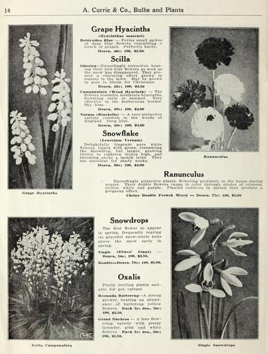 | Keywords: Currie's bulbs and plants (Page 14) (16203623729).jpg 14 <br> A Currie Co Bulbs and Plants <br> Grape Hyacinths <br> Hyacinthus muscari <br> Botryoides Blue Forms small spikes <br> of deep blue flowers resembling' a <br> bunch of grapes Perfectly hardy <br> Dozen 40e; 100 2 50 <br> Scllla <br> Siberica Exceedingly attractive bear- <br> ing their rich blue flowers as soon as <br> the snow has disappeared They pre- <br> sent a charming effect grown in <br> masses in the lawn May be grown <br> in pots to bloom for Christmas <br> Dozen 65c j 100 4 50 <br> Campanulata Wood Hyacinth The <br> flowers resemble miniature hyacinths <br> flowering early in summer Very <br> effective in the herbaceous border <br> Sky blue <br> Dozen 60c; 100 4 00 <br> Nutans Bluebells A very attractive <br> variety common in the woods of <br> England Deep blue <br> Dozen 60c; 100 4 00 <br> Snowflake <br> Leucojuiu Vernuni <br> Delightfully fragrant pure white <br> flowers tipped with green resembling <br> the Snowdrop but larger growing <br> twelve to eighteen inches high and <br> blooming about a month later They <br> are excellent for shady nooks <br> Dozen 60c; 100 4 00 <br> Ranunculus <br> Ranunculus <br> Grape Hyacinth s <br> Exceedingly attractive plants flowering profusely in the house during <br> winter Their double flowers range in color through shades of crimson <br> yellow white and purple Planted outdoors in spring they produce a <br> gorgeous effect <br> Choice Double French Mixed Dozen 75c; 100 5 00 <br> Snowdrops <br> The first flower to appear <br> in spring frequently rearing <br> its graceful snow-white bells <br> above the snow early in <br> spring <br> Single Elwes' Giant <br> Dozen 50c; 100 3 50 <br> Doubl <br> Dozen 70c; 100 5 00 <br> Oxalis <br> Pretty trailing plants suit- <br> able for pot culture <br> Bermuda Buttercup A strong <br> grower bearing an abund- <br> ance of buttercup yellow <br> flowers Each 5c; doz 50c; <br> 100 2 50 <br> Grand Duches s A free flow- <br> ering variety with pretty <br> lavender pink and white <br> flowers Each 5c; doz 50c; <br> 100 2 50 <br> Scilla Campanulata <br> Sing le Snowdrops 42227737 133132 65947 Page 14 Text http //www biodiversitylibrary org/page/42227737 1913 10 5962/bhl title 65947 Currie Brothers Company ; Henry G Gilbert Nursery and Seed Trade Catalog Collection NameFound Botryoides NameConfirmed Botryoides NameBankID 4901327 NameFound Campanulata NameFound Hyacinthus muscari NameConfirmed Hyacinthus muscari L EOLID 1004049 NameBankID 11176233 NameFound Oxalis NameConfirmed Oxalis sect Pseudobulbosae Norlind EOLID 40270 NameFound Ranunculus NameConfirmed Ranunculus EOLID 37662 NameBankID 2576523 NameFound Scilla NameConfirmed Scilla L EOLID 33607 NameFound Siberica NameConfirmed Siberica NameBankID 5328274 Biodiversity Heritage Library Currie's bulbs and plants autumn 1928 Garden Stories Bulbs Plants Catalogs Flowers Nurseries Horticulture Plants Ornamental Seeds U S Department of Agriculture National Agricultural Library bhl page 42227737 dc identifier http //biodiversitylibrary org/page/42227737 bhlGardenStories Grape Hyacynth Ranunculus Scilla snow drops Currie's BHLinbloom bulbs plants nurseries horticulture plants ornamental u s department of agriculture national agricultural library bhlgardenstories bhlinbloom Information field Flickr posted date ISOdate 2015-01-28 PD-old-70-1923 Unidentified Ranunculus 1913 books Currie's bulbs and plants Photos uploaded from Flickr by Fæ using a script Files from the Biodiversity Heritage Library released as Attribution-NonCommercial-ShareAlike |