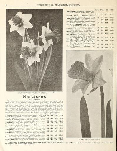| Keywords: Currie's bulbs and plants (Page 6) (15817731023).jpg CURRIE BROS CO MILWAUKEE WISCONSIN <br> NARCISSUS BICOLOR VICTORIA <br> Narcissus <br> DAFFODILS <br> No class of bulbs is more satisfactory and hone so easily taken <br> care of as the Daffodils They appear just after the snow and ice <br> of winter and enliven our gardens and lawns Nothing can excel <br> the beauty and chastity of their blooms and they have the advant- <br> age of being good for an unlimited number of seasons if planted <br> out in some spot where they can be allowed to mature their foli- <br> age They are perfectly hardy and withstand our severe winters <br> without protection Should be given the same treatment as recom- <br> mended for Hyacinths either for indoor or outdoor cultivation <br> Each Doz 100 1000 <br> Ard Hiuh Irish King Large early yellow 05 45 3 25 25 00 <br> Barrii Conspieuus Primrose crown edged <br> orange 03 25 1 75 13 00 <br> Bicolor Victoria Extra large flower peri- <br> anth pure white trumpet yellow 04 40 3 00 22 00 <br> Blnoius White with yellow cup 03 30 2 00 15 00 <br> Bulbocodium Large Yellow Hoop Petticoat <br> Rich golden yellow 05 50 3 75 30 00 <br> Cynosure Yellowish perianth deep orange <br> stained cup <br> Emporor Very large deep full yellow of <br> fine substance 04 35 2 50 <br> Empress Flowers very large and of great <br> substance and a robust grower trumpet <br> large rich full yellow petals white 04 35 <br> Golden Spur Early large deep yellow trum- <br> pet perianth large and broad 04 40 <br> Henry Irving Early bold flower rich yellow 04 40 <br> 03 25 1 75 13 00 <br> 20 00 <br> 2 50 <br> 3 00 <br> 3 00 <br> 20 00 <br> 22 00 <br> 22 00 <br> Each <br> Horsfieldi Immense flowers yel- <br> low trumpet with white peri- <br> anth 04 <br> Leedsi Mrs Langtry Silver <br> white perianth primrose cup 03 <br> Maximus Early and large color <br> deep golden yellow 04 <br> Poeticus Pheasant's Eye Snow <br> white citron cup 03 <br> Poeticus Ornatiis -Earlier than <br> the preceding; flowers white <br> scarlet eye 03 <br> Princeps Large yellow trumpet <br> with sulphury perianth 03 <br> Stella Early white perianth and <br> yellow crown 03 <br> Sir Watkin Enormous flowers <br> trumpet rich yellow suffused <br> with orange sulphur perianth 04 <br> Trumpet Major Dutch Single <br> Von Sion Large yellow 03 <br> Trumpet Major French For <br> Christmas forcing; extra <br> large bulbs 03 <br> Mixed Trumpet A r arieties All <br> colors 03 <br> Doz <br> 100 <br> 1000 <br> 35 <br> 2 50 <br> 20 00 <br> 25 <br> 1 75 <br> 13 00 <br> 35 <br> 2 25 <br> 18 00 <br> 25 <br> 1 25 <br> 8 00 <br> 25 <br> 1 35 <br> 9 00 <br> 30 <br> 1 75 <br> 13 00 <br> 30 <br> 2 00 <br> 10 00 <br> 35 <br> 2 50 <br> 20 00 <br> 30 <br> 2 00 <br> 16 00 <br> 35 <br> 2 25 <br> 1S 00 <br> 30 <br> 2 00 <br> 10 00 <br> NARCISSUS EMPRESS <br> Narcissus at dozen and 100 prices delivered tree to any Postoffice or Express Office in the United States <br> by express at purchaser's expense <br> At 1000 rates 42159890 132797 65947 Page 6 Text http //www biodiversitylibrary org/page/42159890 1913 10 5962/bhl title 65947 Currie Brothers Company ; Henry G Gilbert Nursery and Seed Trade Catalog Collection NameFound Bicolor NameConfirmed Bicolor NameBankID 5087502 NameFound Bulbocodium NameConfirmed Bulbocodium EOLID 13034220 NameBankID 3494609 NameFound Conspieuus NameFound Maximus NameConfirmed Maximus NameFound Narcissus bicolor NameConfirmed Narcissus bicolor EOLID 1115912 NameBankID 5908575 NameFound Poeticus NameFound Sion NameConfirmed Sion NameBankID 4854187 NameFound Victoria NameConfirmed Victoria EOLID 34123 NameBankID 897688 Biodiversity Heritage Library Currie's bulbs and plants autumn 1913 new album Garden Stories Bulbs Plants Catalogs Flowers Nurseries Horticulture Plants Ornamental Seeds U S Department of Agriculture National Agricultural Library bhl page 42159890 dc identifier http //biodiversitylibrary org/page/42159890 bhlGardenStories narcissus BHLinbloom bulbs plants nurseries horticulture plants ornamental u s department of agriculture national agricultural library bhlgardenstories bhlinbloom Information field Flickr posted date ISOdate 2015-02-03 PD-old-70-1923 1913 books Currie's bulbs and plants Photos uploaded from Flickr by FĂŚ using a script Files from the Biodiversity Heritage Library released as Attribution-NonCommercial-ShareAlike Unidentified Narcissus |