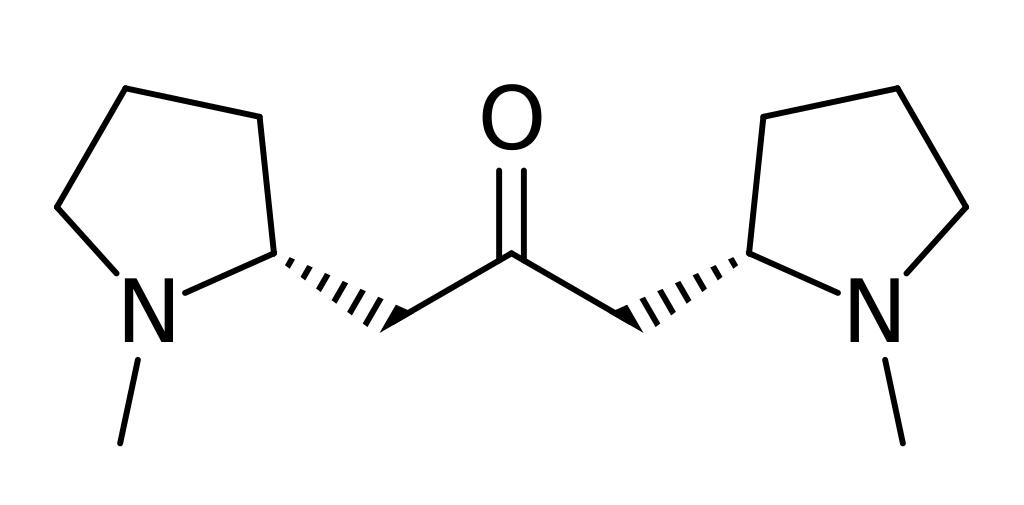 Keywords: Cuscohygrine.svg Chemical structure of cuscohygrine Own 15 12 7 February 2016 UTC Ed Edgar181 Pyrrolidine alkaloids Ketones