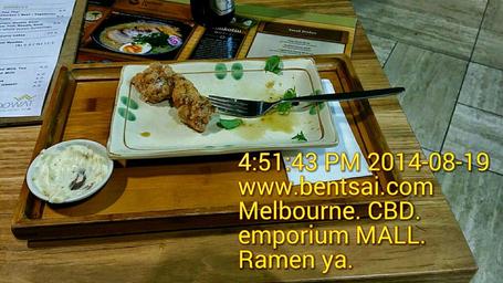 The chicken karaage was moist, juicy n tender. There were no fats. Ample portion for the price. Crisp side salad with delicious dressing. Good portion ratio of chicken with salad side. Aesthetically presented on a ceramic plate with a wooden tray. Jap style.