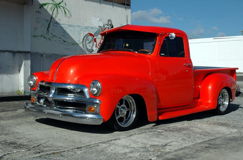 Keywords: customized red pickup truck restored transportation vehicle design show tires clean shiny grille technology drive speed power wheel