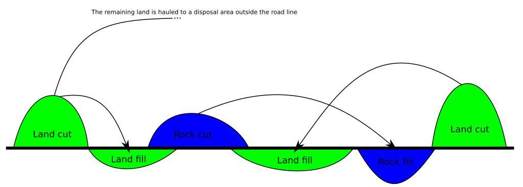Keywords: CutFill.svg en A mass haul diagram showing land mass being hauled to land fills and rock mass being hauled to rock fill The road line station number goes from left to right This is a simple example of a cut and fill operation in civil engineering earthworks own Kem wiki 2010-11-09 Cc-zero Civil engineering