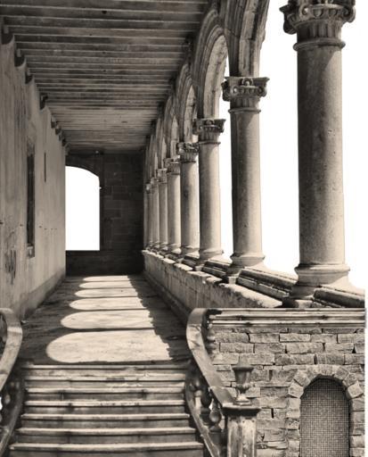 Keywords: cutout collage cut out clipping building environment altered veranda porch portico arches arcade staircase stairs steps backdrop stone columns architecture perspective