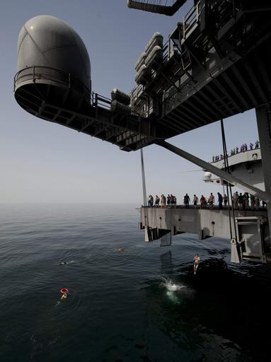 | Keywords: CVN-70-120323-N-DR144-596 ARABIAN SEA (March 23, 2012) Sailors jump off aircraft elevator No. 4 uring a swim call aboard the Nimitz-class aircraft carrier USS Carl Vinson (CVN 70).JPG  en 120323-N-DR144-596 ARABIAN SEA March 23 2012 Sailors jump off aircraft elevator No 4 during a swim call aboard the Nimitz-class aircraft carrier USS Carl Vinson CVN 70 Carl Vinson and Carrier Air Wing CVW 17 are deployed to the U S 5th Fleet area of responsibility U S Navy photo by Mass Communication Specialist 2nd Class James R Evans/Released ru Вве ху на пе еднем плане  «палец» небольшой участок палубы в ко му от 4-го элевато а с консольно зак еплённой на нём площадкой для  ада а 2012-03-23 http //www navy mil/view_image asp id 120117 U S Navy photo by Mass Communication Specialist 2nd Class James R Evans/Released PD-USGov Uploaded with UploadWizard Aboard USS Carl Vinson CVN-70 |