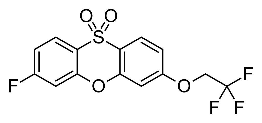 Keywords: CX157 structure.svg validSVG Skeletal formula of CX157 3-fluoro-7- 2 2 2-trifluoroethoxy phenoxathiine 10 10-dioxide Tyrima Created using http //www acdlabs com/download/chemsk html ACD/ChemSketch 10 0 Inkscape and vim Own work after Fielding R Mielach F Free J Pande A 2007 http //www aapsj org/abstracts/AM_2007/AAPS2007-001233 PDF Pharmacokinetics and oral bioavailability of CX157 a reversible selective MAO-A inhibitor in primates 2007 AAPS Annual Meeting Exposition Retrieved on 2009-06-14 2009-06-14 Fvasconcellos Reversible inhibitors of MAO-A Trifluoromethyl compounds Sulfones Monofluorobenzenes Heterocyclic compounds with 3 rings |
