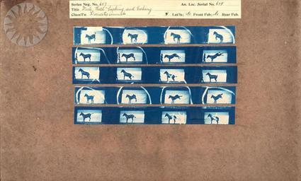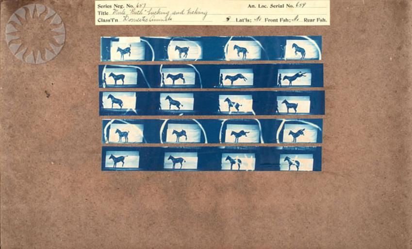 Keywords: photography physics inventors muybridge smithsonian probably public domain probablypublicdomain SI Neg. 2004-41348. Date: na....Title: "Mule 'Ruth' bucking and kicking.".Series Neg. No. 657.An. Loc. Serial No. 659.Classification: "Domestic Animals.".Muybridge's cyanotypes are working proofs, the contact prints he made from more than 20,000 negatives he took at the University of Pennsylvania between 1884 and 1886 while photographing human and animal subjects in motion from lateral (parallel), front and rear positions. Since the original negatives no longer exist, the cyanotypes provide us with the opportunity to see the pictures Muybridge achieved before he edited and cropped them for publication..From the Photographic History Collection, National Museum of American History...Credit: Eadweard Muybridge (Smithsonian Institution) SI Neg. 2004-41348. Date: na....Title: "Mule 'Ruth' bucking and kicking.".Series Neg. No. 657.An. Loc. Serial No. 659.Classification: "Domestic Animals.".Muybridge's cyanotypes are working proofs, the contact prints he made from more than 20,000 negatives he took at the University of Pennsylvania between 1884 and 1886 while photographing human and animal subjects in motion from lateral (parallel), front and rear positions. Since the original negatives no longer exist, the cyanotypes provide us with the opportunity to see the pictures Muybridge achieved before he edited and cropped them for publication..From the Photographic History Collection, National Museum of American History...Credit: Eadweard Muybridge (Smithsonian Institution) |