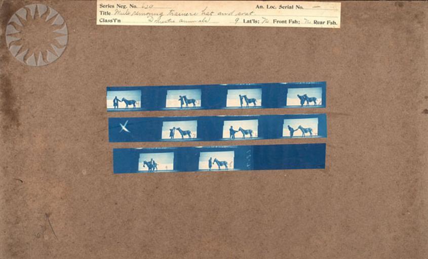Keywords: photography physics inventors muybridge smithsonian probably public domain probablypublicdomain SI Neg. 2004-41324. Date: na....Title: "Mule removing trainers hat and coat.".Series Neg. No. 629.An. Loc. Serial No. None.Classification: "Domestic Animals.".Muybridge's cyanotypes are working proofs, the contact prints he made from more than 20,000 negatives he took at the University of Pennsylvania between 1884 and 1886 while photographing human and animal subjects in motion from lateral (parallel), front and rear positions. Since the original negatives no longer exist, the cyanotypes provide us with the opportunity to see the pictures Muybridge achieved before he edited and cropped them for publication..From the Photographic History Collection, National Museum of American History...Credit: Eadweard Muybridge (Smithsonian Institution) SI Neg. 2004-41324. Date: na....Title: "Mule removing trainers hat and coat.".Series Neg. No. 629.An. Loc. Serial No. None.Classification: "Domestic Animals.".Muybridge's cyanotypes are working proofs, the contact prints he made from more than 20,000 negatives he took at the University of Pennsylvania between 1884 and 1886 while photographing human and animal subjects in motion from lateral (parallel), front and rear positions. Since the original negatives no longer exist, the cyanotypes provide us with the opportunity to see the pictures Muybridge achieved before he edited and cropped them for publication..From the Photographic History Collection, National Museum of American History...Credit: Eadweard Muybridge (Smithsonian Institution) |