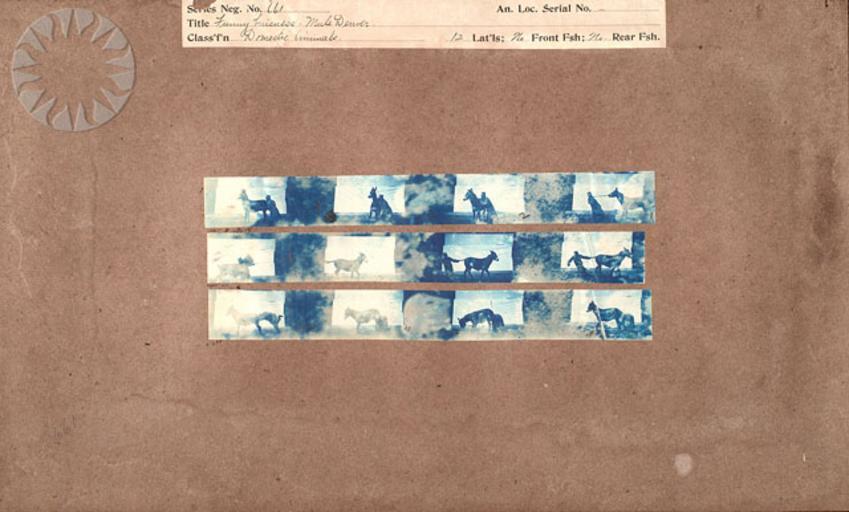 Keywords: photography physics inventors muybridge smithsonian probably public domain probablypublicdomain SI Neg. 2004-41352. Date: na....Title: "Funny business - Mule Denver.".Series Neg. No. 661.An. Loc. Serial No. None.Classification: "Domestic Animals.".Muybridge's cyanotypes are working proofs, the contact prints he made from more than 20,000 negatives he took at the University of Pennsylvania between 1884 and 1886 while photographing human and animal subjects in motion from lateral (parallel), front and rear positions. Since the original negatives no longer exist, the cyanotypes provide us with the opportunity to see the pictures Muybridge achieved before he edited and cropped them for publication..From the Photographic History Collection, National Museum of American History...Credit: Eadweard Muybridge (Smithsonian Institution) SI Neg. 2004-41352. Date: na....Title: "Funny business - Mule Denver.".Series Neg. No. 661.An. Loc. Serial No. None.Classification: "Domestic Animals.".Muybridge's cyanotypes are working proofs, the contact prints he made from more than 20,000 negatives he took at the University of Pennsylvania between 1884 and 1886 while photographing human and animal subjects in motion from lateral (parallel), front and rear positions. Since the original negatives no longer exist, the cyanotypes provide us with the opportunity to see the pictures Muybridge achieved before he edited and cropped them for publication..From the Photographic History Collection, National Museum of American History...Credit: Eadweard Muybridge (Smithsonian Institution) |