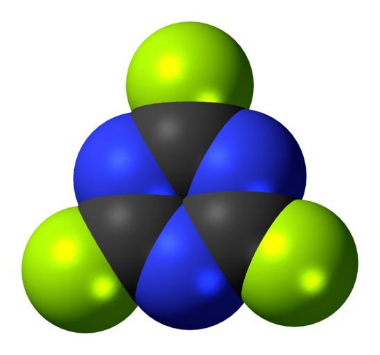 Keywords: Cyanuric-fluoride-3D-spacefill.png Space-filling model of the cyanuric fluoride molecule Colour code 505050 Carbon C black<br> F0F0F0 Hydrogen H white<br> 3C50FA Nitrogen N blue<br> C8FA00 Yellow-green Fluorine F<br> 2011-06-11 own DS Visualizer Jynto talk Ball-and-stick version cc-zero Triazines Fluoroaromatics Fluorinating agents Images by Jynto Space-filling models |