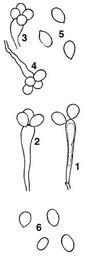 Keywords: Cyathus-olla-in-Martin-1927.jpg en Basidia and spores of the bird's nest fungus Cyathus olla Figures renumbered <br /> 1-3 Mature basidia with two three and four spores; <br />4 Basidium collapsing with spores still attached; <br />5 Spores immediately after separation from basidia showing conspicuous apiculus; <br />6 Older spores; apiculus nearly or quite gone Martin GW 1927 Basidia and spores of the Nidulariaceae Mycologia 19 5 239-247 Plate 22 George W Martin 1927 PD-old Cyathus olla |